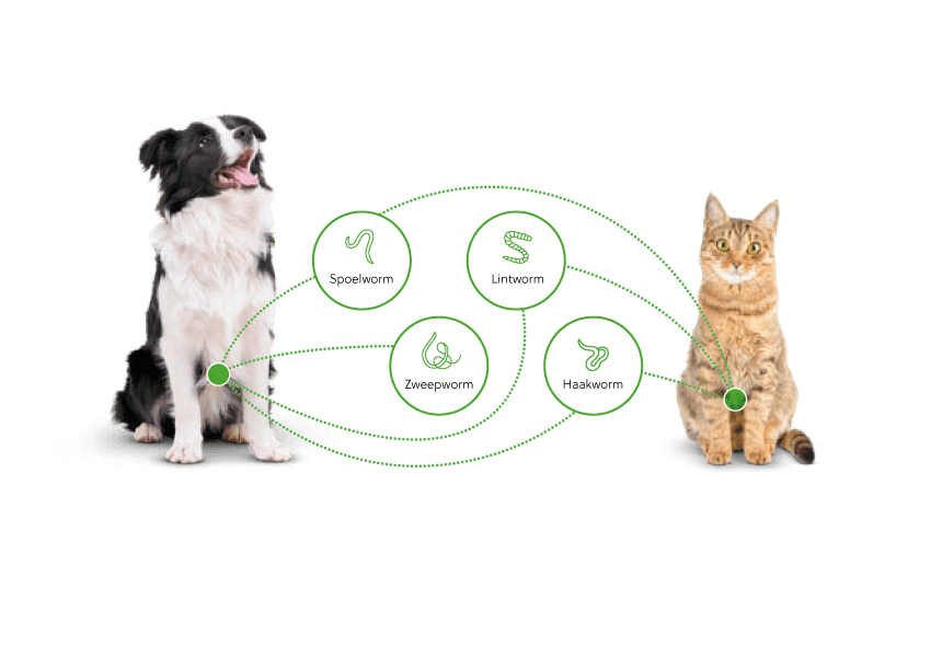 N.B. Ook wormen die in ons land minder vaak voorkomen – zoals de haakworm, zweepworm (enkel bij honden), longworm en hartworm – kunnen tot nare klachten leiden. Wees daar alert op als je met je hond of kat naar het buitenland gaat. Volg het ontwormingsadvies van het land van bestemming of vraag advies aan je apotheker of dierenarts.